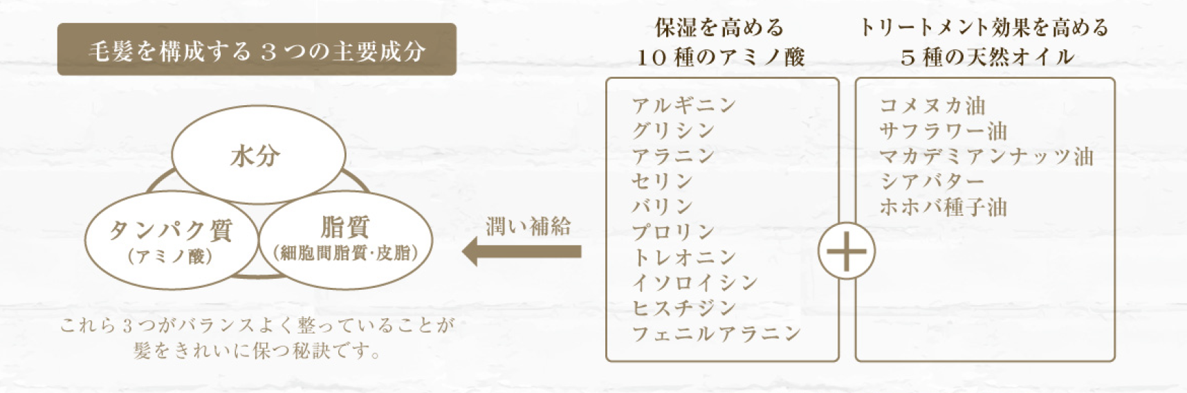 脂肪酸と天然植物オイル、アミノ酸の補修と保湿、トリートメントは頭皮ケア、アウトバス、ハンドケアとしても使えます。